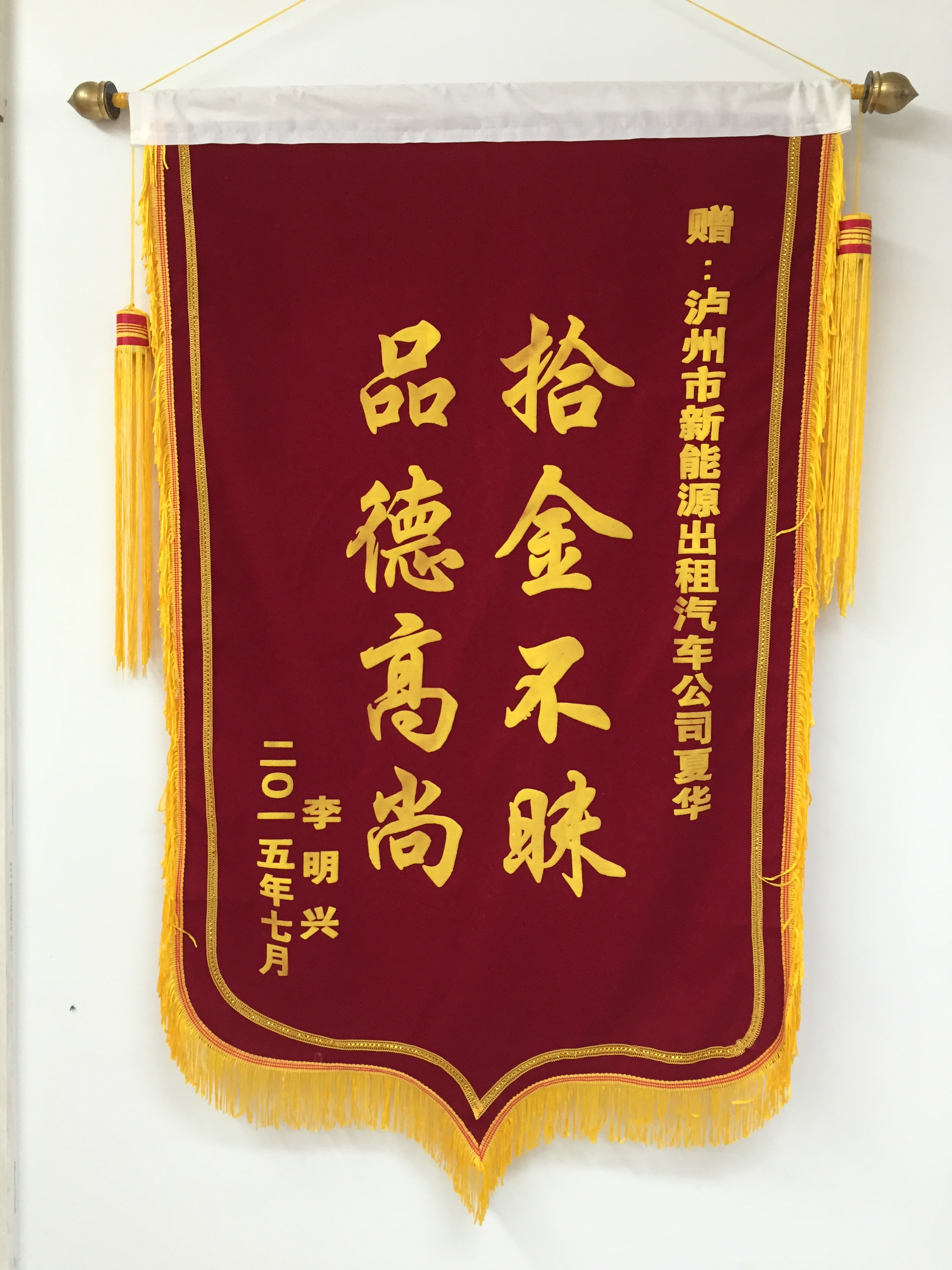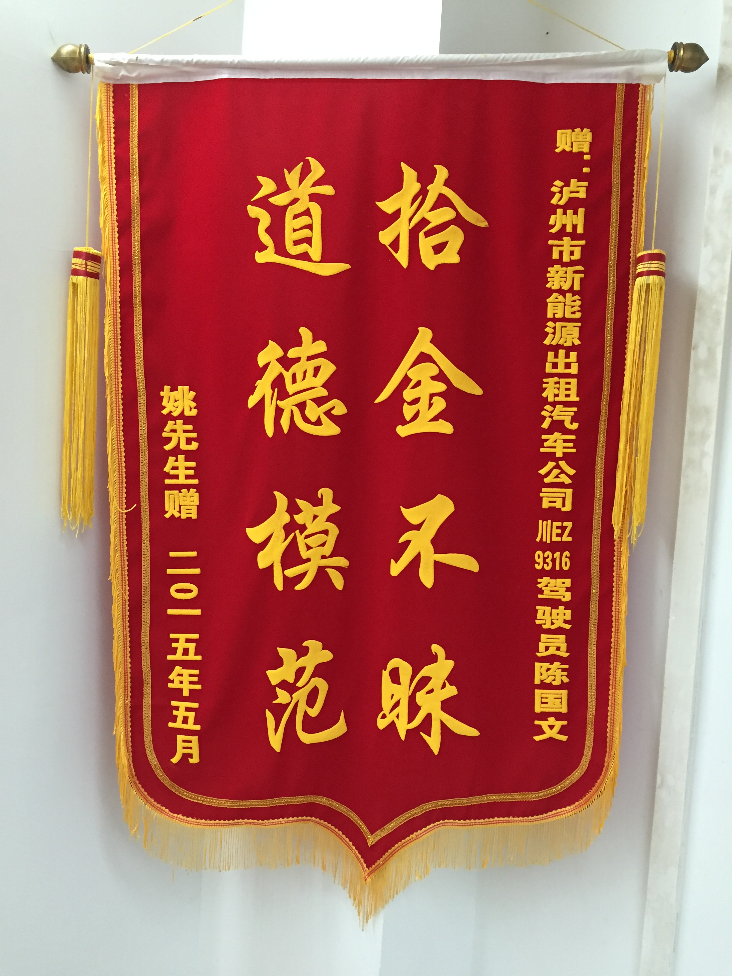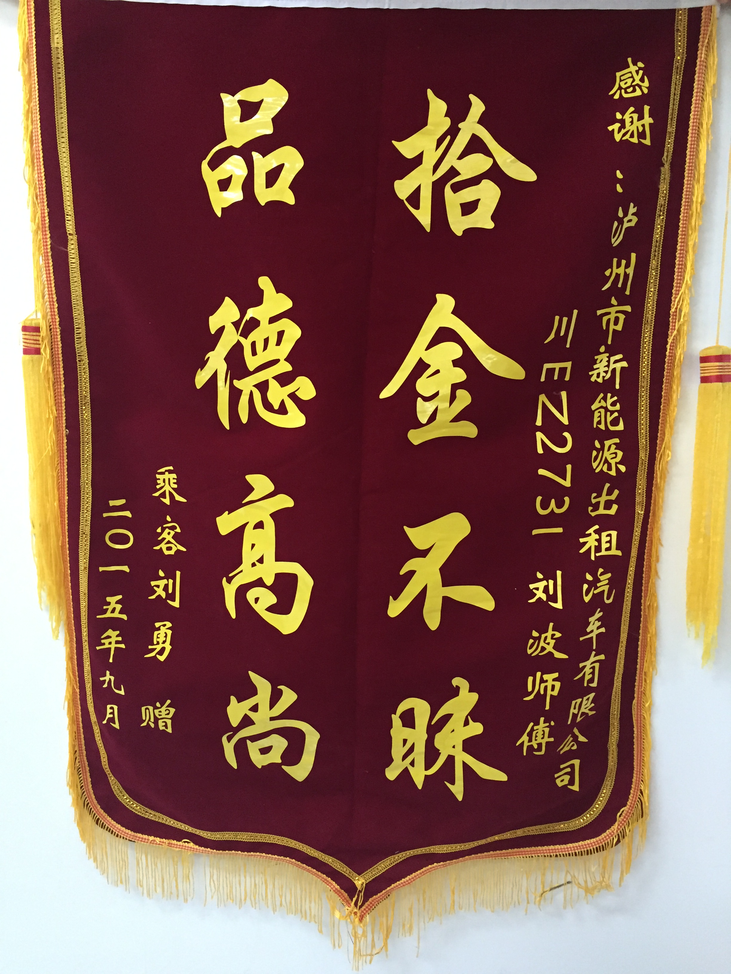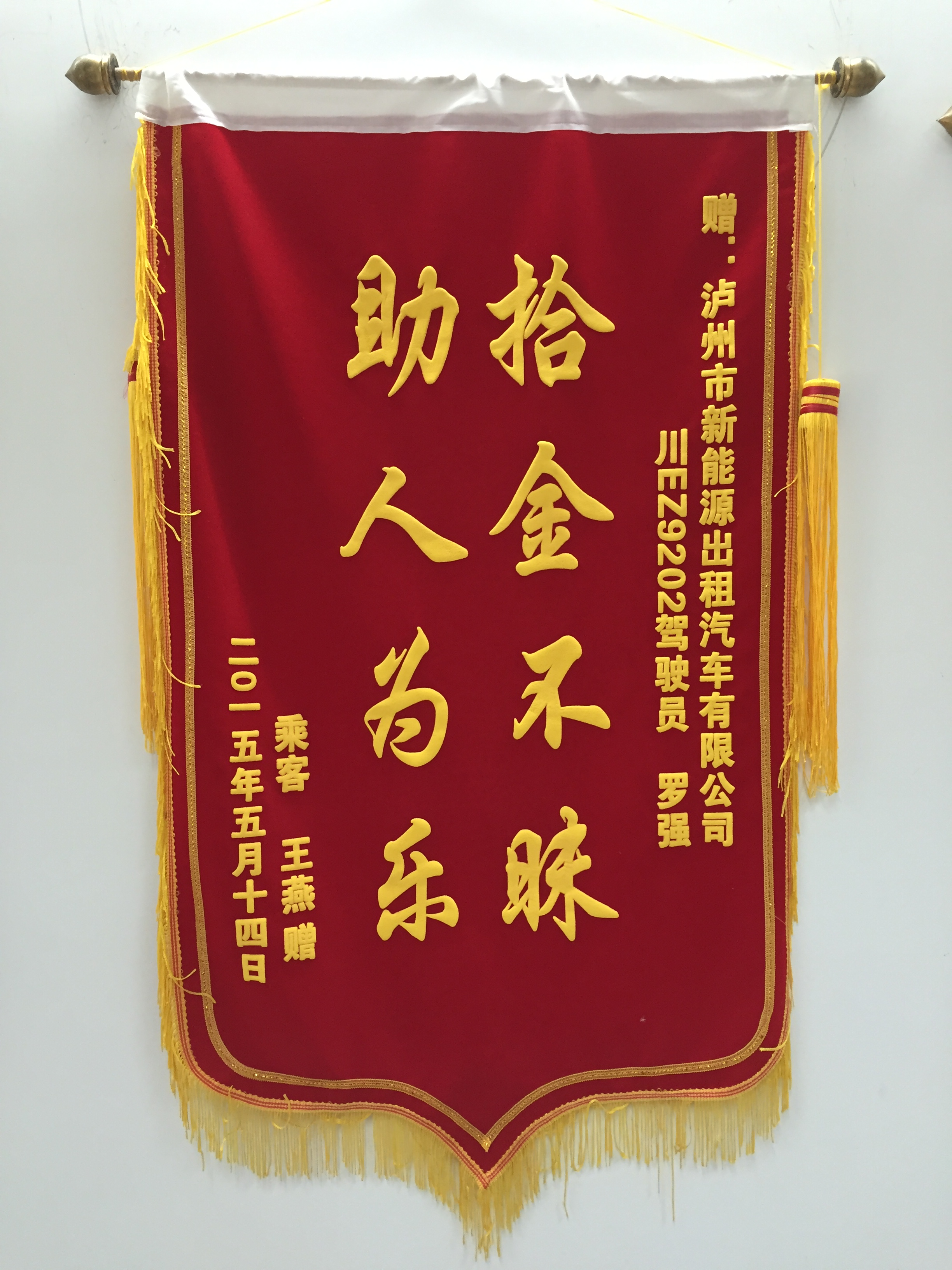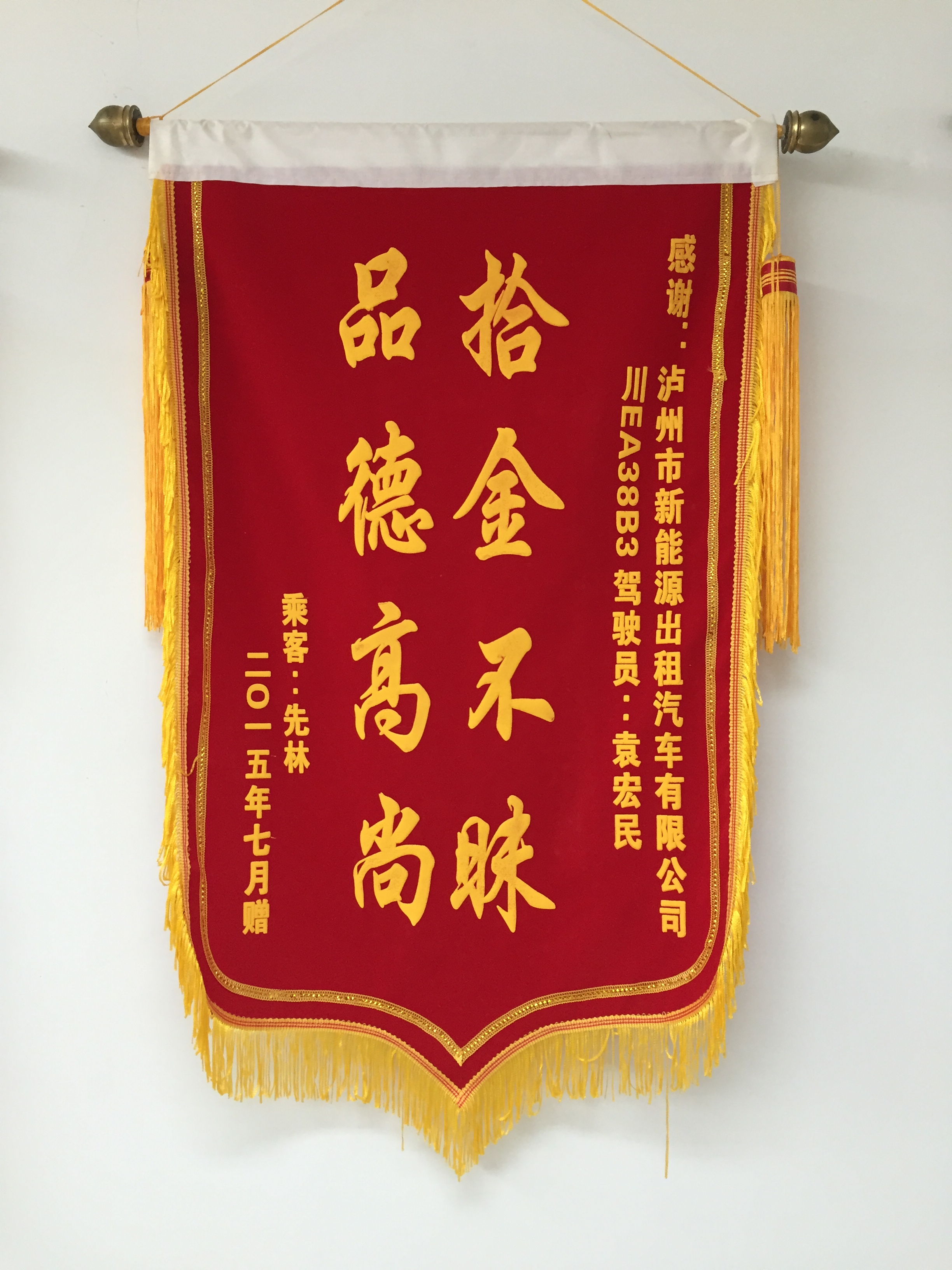 川EA38B3駕駛員袁宏民7月30日拾到三星手機一部,已交還乘客。乘客送來錦旗感謝